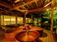 四季彩の庭園美を眺めながら畳廊下を行くと、心和む湯船を持つ自慢の日本庭園風呂「庭の湯・滝の湯」があります。入浴後は四季折々に映える旬の素材を生かした料理長おすすめの月替わり会席と地酒をお楽しみいただけます。
