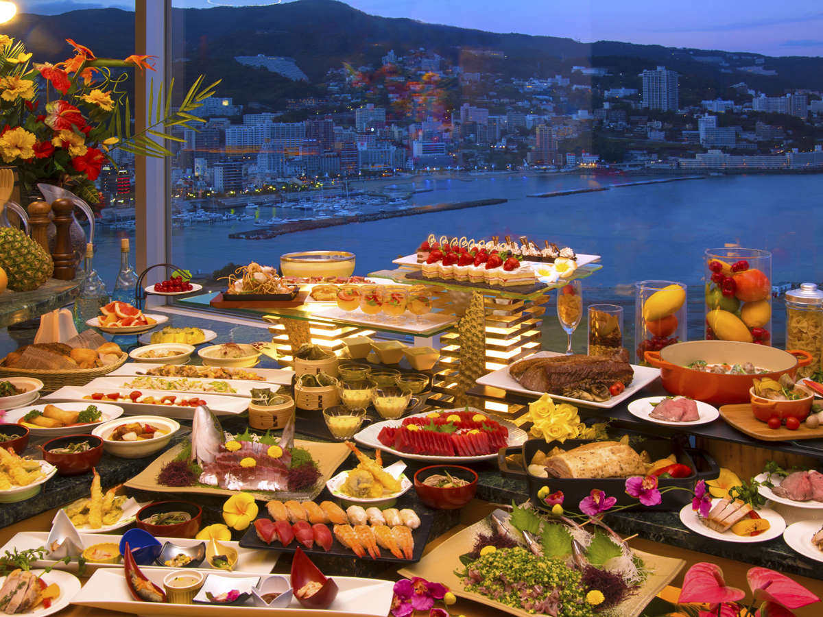 【夕食】 レストラン/和洋中ブッフェ (TOP・OF・ATAMI)にて 【朝食】 レストラン/和洋ブッフェ |