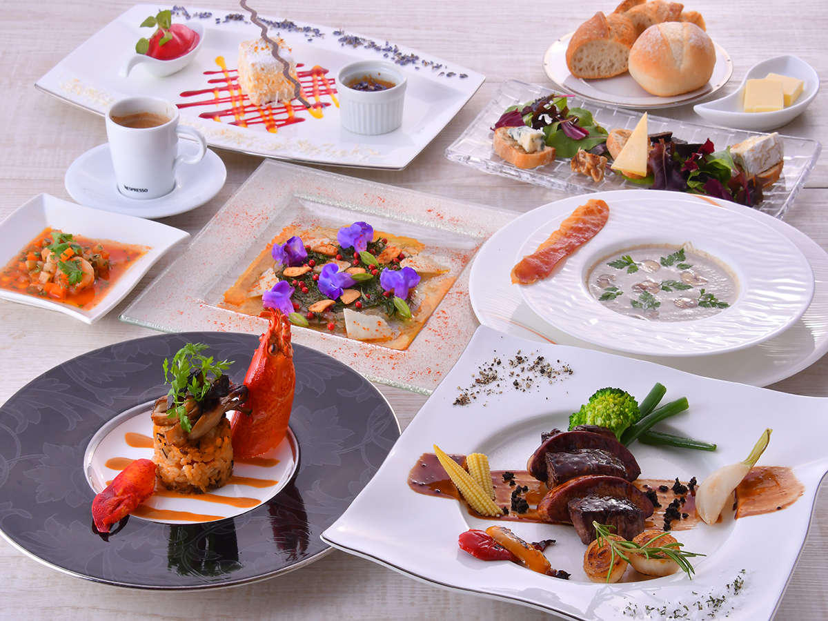【夕食】 レストラン「ボヌール」/ 創作フレンチコース 又は 和食堂「舞扇」/ 和食会席コース 【朝食】 レストラン/セットメニュー |